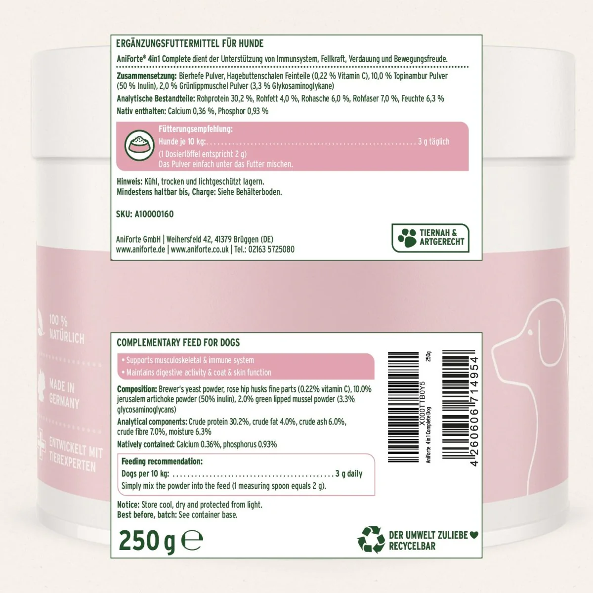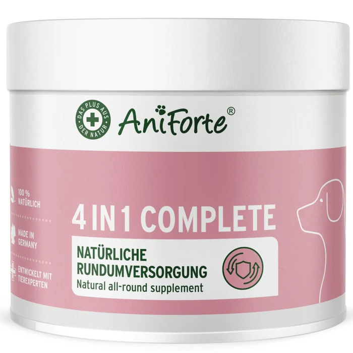 Komplexná výživa pre psovje zabezpečená doplnkovým krmivom AniForte 4in1 Complete Dog, ktoré je určené na každodenné doplnenie stravy psa. Prírodné zloženie je vhodné ako súčasť každodennej starostlivosti o zdravie a pohodu zvieraťa.