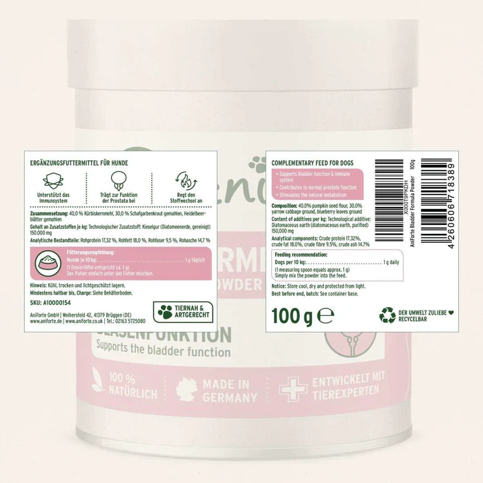 AniForte Blasen Formel je doplnkové krmivo pre psy a mačky určené na podporu normálnej funkcie močového systému. Produkt je vhodný ako súčasť každodennej výživy zvierat, najmä v prípadoch, keď je potrebná zvýšená pozornosť venovaná močovým cestám. Doplnok je určený na bežné podávanie a nenahrádza veterinárnu starostlivosť.
