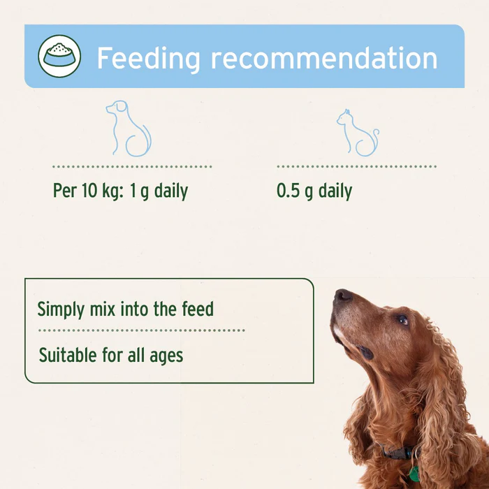 Pri dlhodobom používaní je vhodné sledovať celkové energetické a nutričné zloženie stravy zvieraťa a zabezpečiť dostatok vody. Prášok je možné primiešať do suchého alebo vlhkého krmiva.