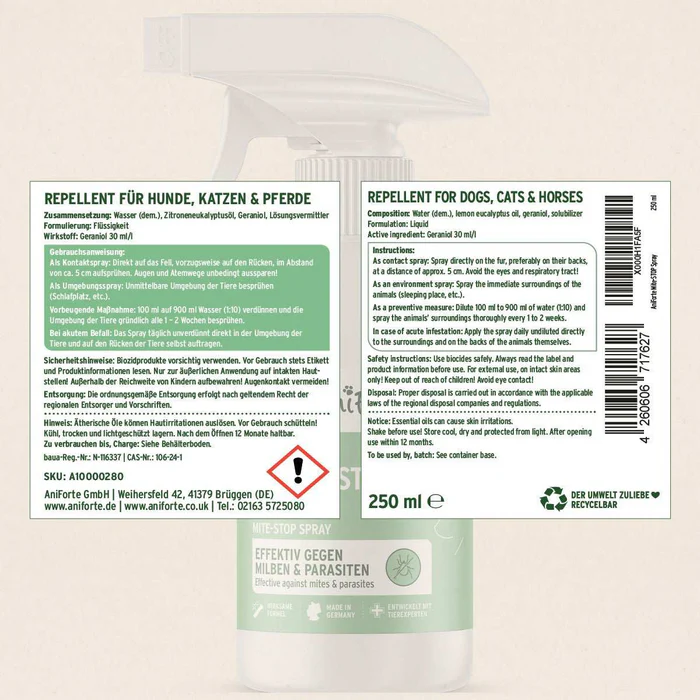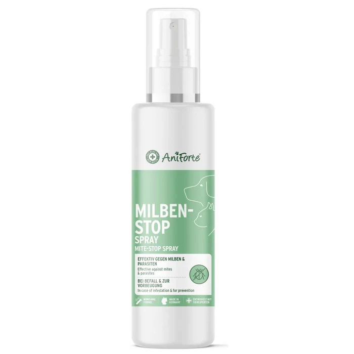 AniForte Milben-STOP Spray proti roztočom pre psy a mačky je prípravok na báze prírodných zložiek, určený na podporu ochrany proti roztočom v prostredí zvierat a na ich srsti. Môže sa používať preventívne aj pri zvýšenom výskyte roztočov ako súčasť pravidelnej hygieny.