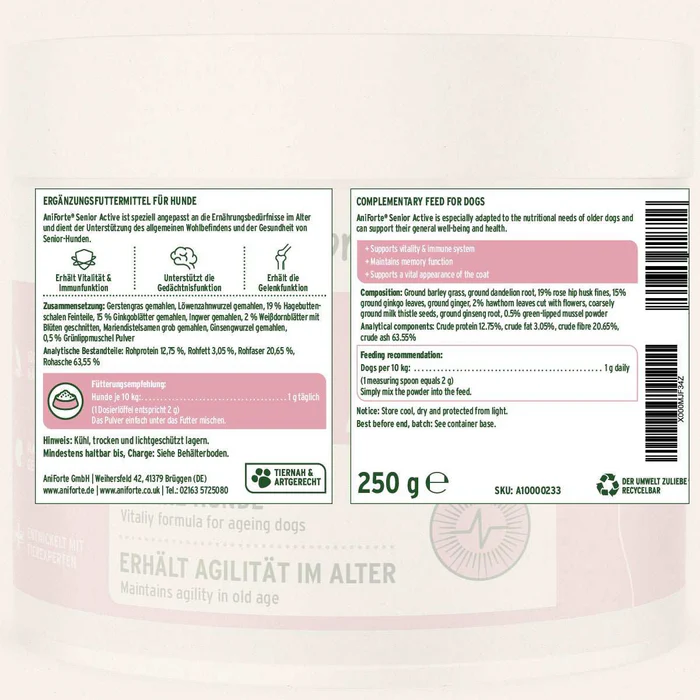 AniForte Senior Active je doplnkové krmivo pre psy, vyvinuté špeciálne pre potreby starších psov. Produkt je určený na podporu pohybového aparátu a vitality v období starnutia a je vhodný ako súčasť dlhodobej preventívnej starostlivosti.