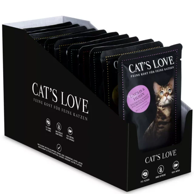 Cat’s Love kapsičky pre dospelé mačky vznikli v spolupráci s veterinármi a rešpektujú prirodzené potreby mačiek ako mäsožravcov. Receptúra obsahuje vysoký podiel mäsa a zároveň neobsahuje obilniny ani pridaný cukor. Výrobca sa zameriava na jednoduché zloženie a kvalitné suroviny. Preto kapsičky poskytujú chutné a prirodzené mokré krmivo vhodné na každodenné kŕmenie.Príchute v balení