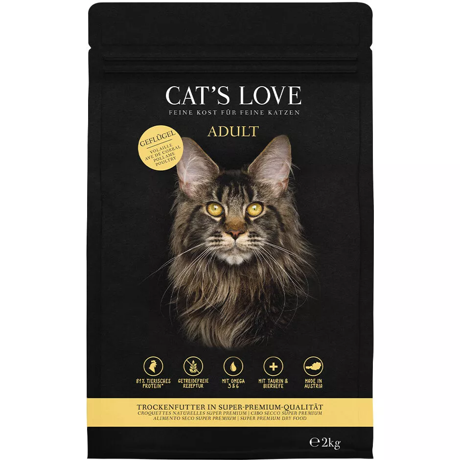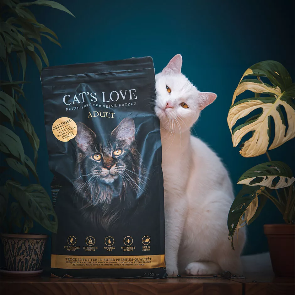 Cat’s Love krmivo pre dospelé mačky s hydinovým mäsom je kompletné krmivo bez obilnín s vysokým podielom živočíšnych bielkovín. Receptúra podporuje zdravé trávenie, vitalitu a krásnu srsť.