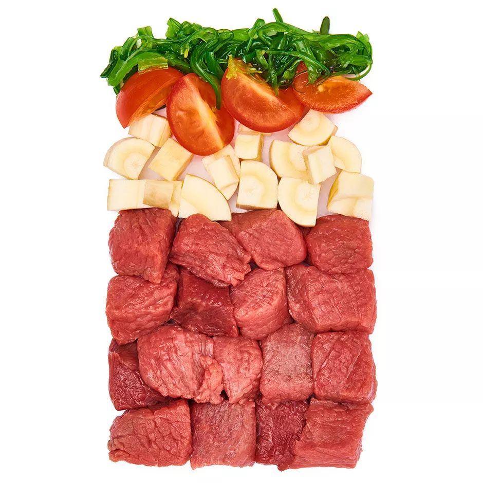- 60 % konského mäsa, veľa čerstvej zeleniny a ovocia