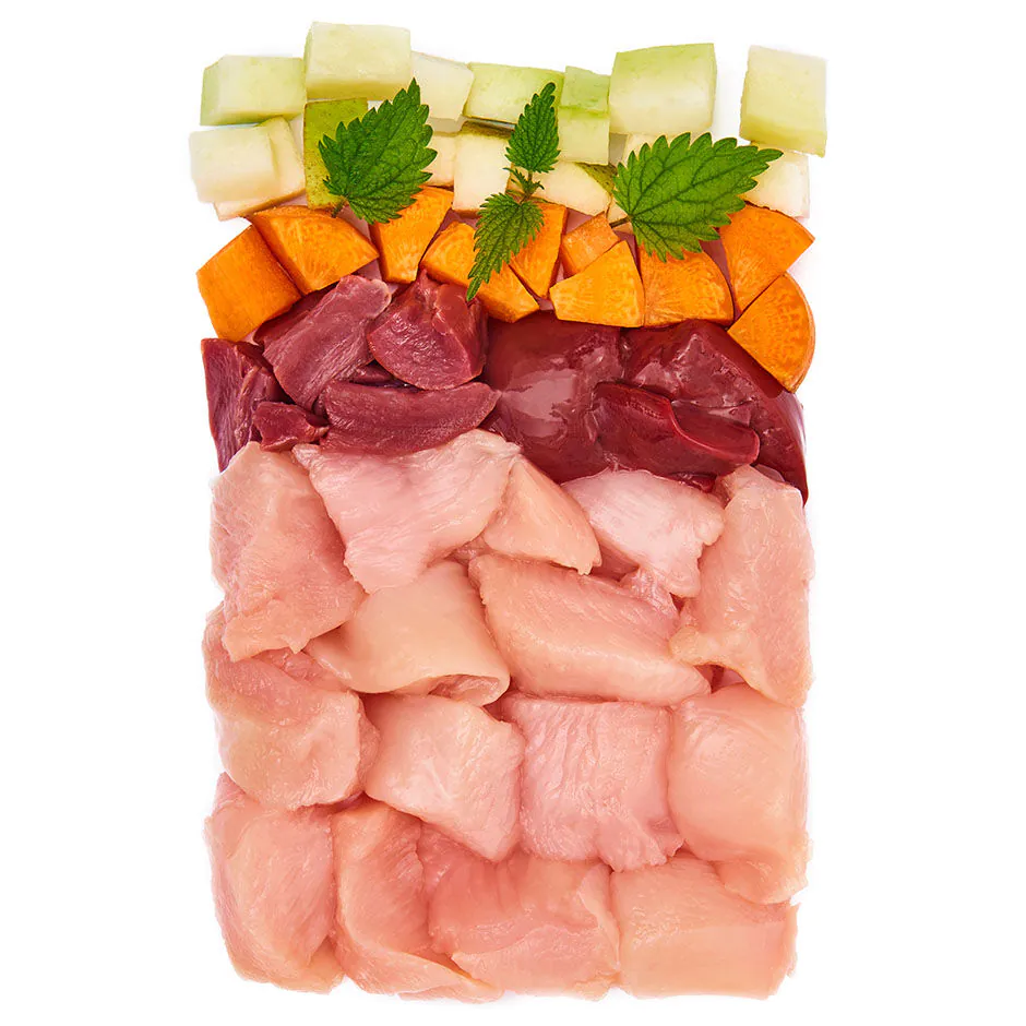 - kuracie mäso 55 % (mäso 29 %, srdce 16 %, pečeň 10 %),