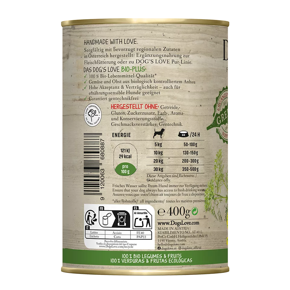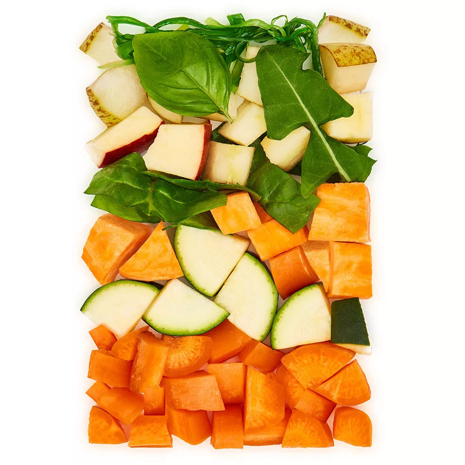 Naše bio zeleniny s jemne tepelne upraveným, bio certifikovaným ovocím a zeleninou ponúkajú optimálny doplnok ku kŕmeniu s odrodami Pure Meat – alebo dokonca so surovým mäsom.