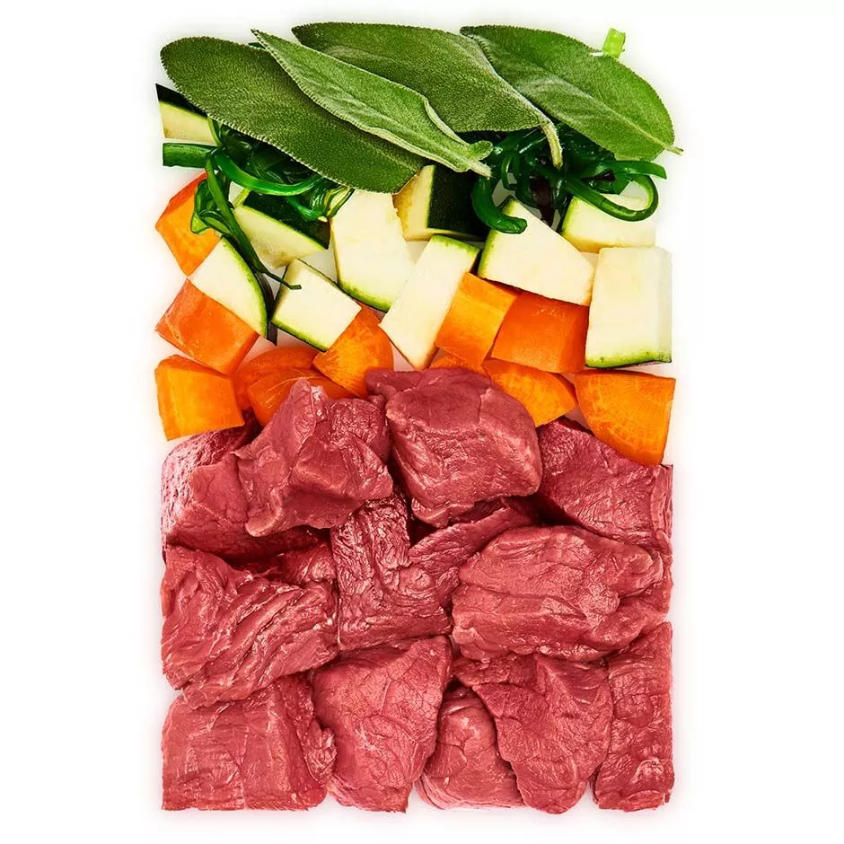 hovädzie mäso 64 % (svalovina 32,5 %, srdcia 29,5 %, pečeň 2 %), mrkva 19 %, cuketa 8 %, minerálne látky, olej z pestreca mariánskeho, lososový olej, listy šalvie 0,1 %, žerucha, morské riasy, prášok z vaječných škrupín 0,01 %.