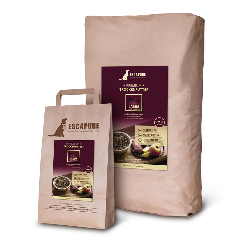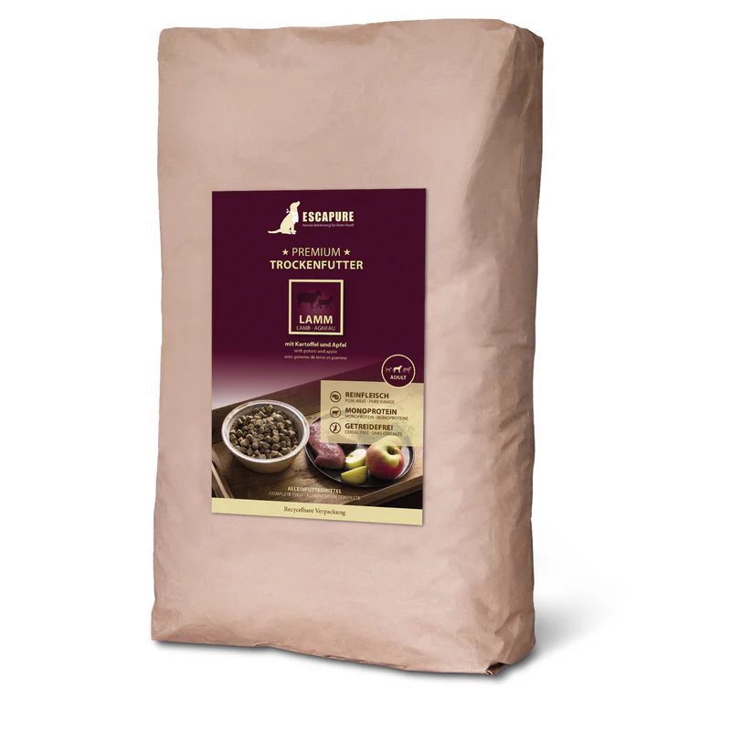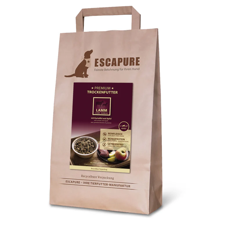 Escapure granuly pre psov z jahňaciny predstavujú kompletné a vyvážené suché krmivo pre dospelé psy. Obsahujú 40 % jahňacieho mäsa ako hlavný zdroj kvalitných živočíšnych bielkovín. Receptúra neobsahuje obilniny ani umelé farbivá či konzervanty. Granuly pre psov podporujú silné svaly, zdravé trávenie a optimálnu kondíciu. Vhodné sú pre psy všetkých plemien, vrátane citlivejších jedincov.