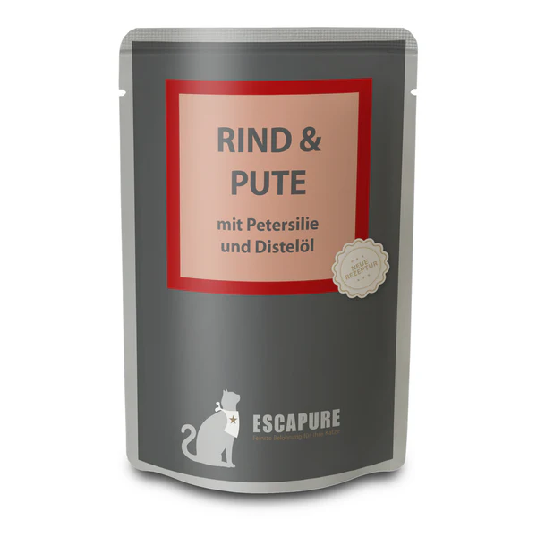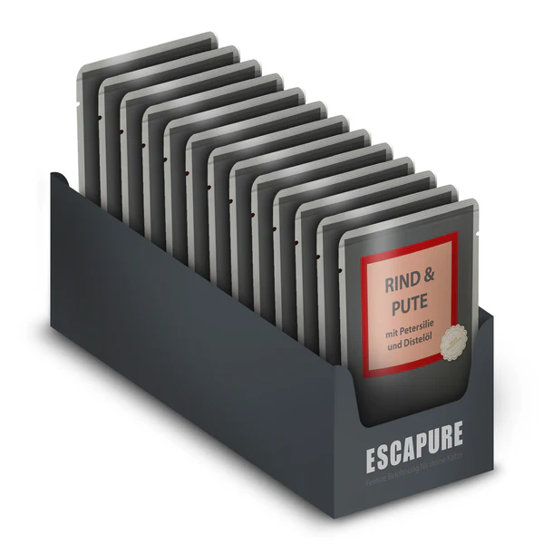 Escapure kapsičky pre mačky kombinujú hovädzie a morčacie mäso s petržlenovou vňaťou. Vysoký podiel mäsa podporuje prirodzené potreby mačky ako mäsožravca. Navyše receptúra neobsahuje obilniny ani umelé prísady. Šťavnatá textúra podporuje príjem tekutín. Preto sa hodia pre dospelé mačky všetkých plemien.