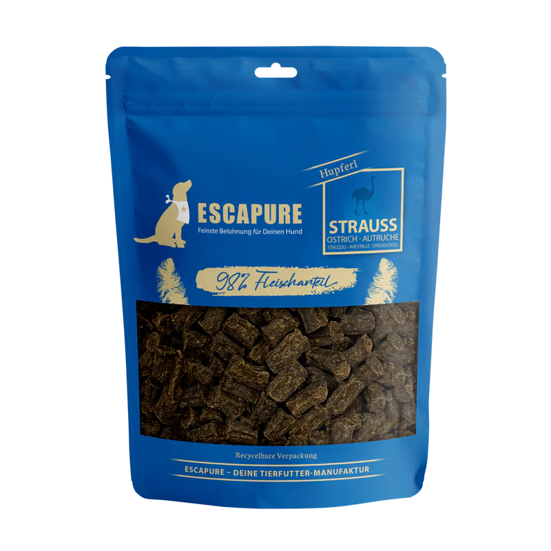 Escapure maškrty pre psov Pštrosie kúsky sú mäkké mäsové odmeny s vysokým podielom pštrosieho mäsa. Vďaka praktickej veľkosti a výraznej chuti sú ideálne na tréning aj každodenné odmeňovanie.