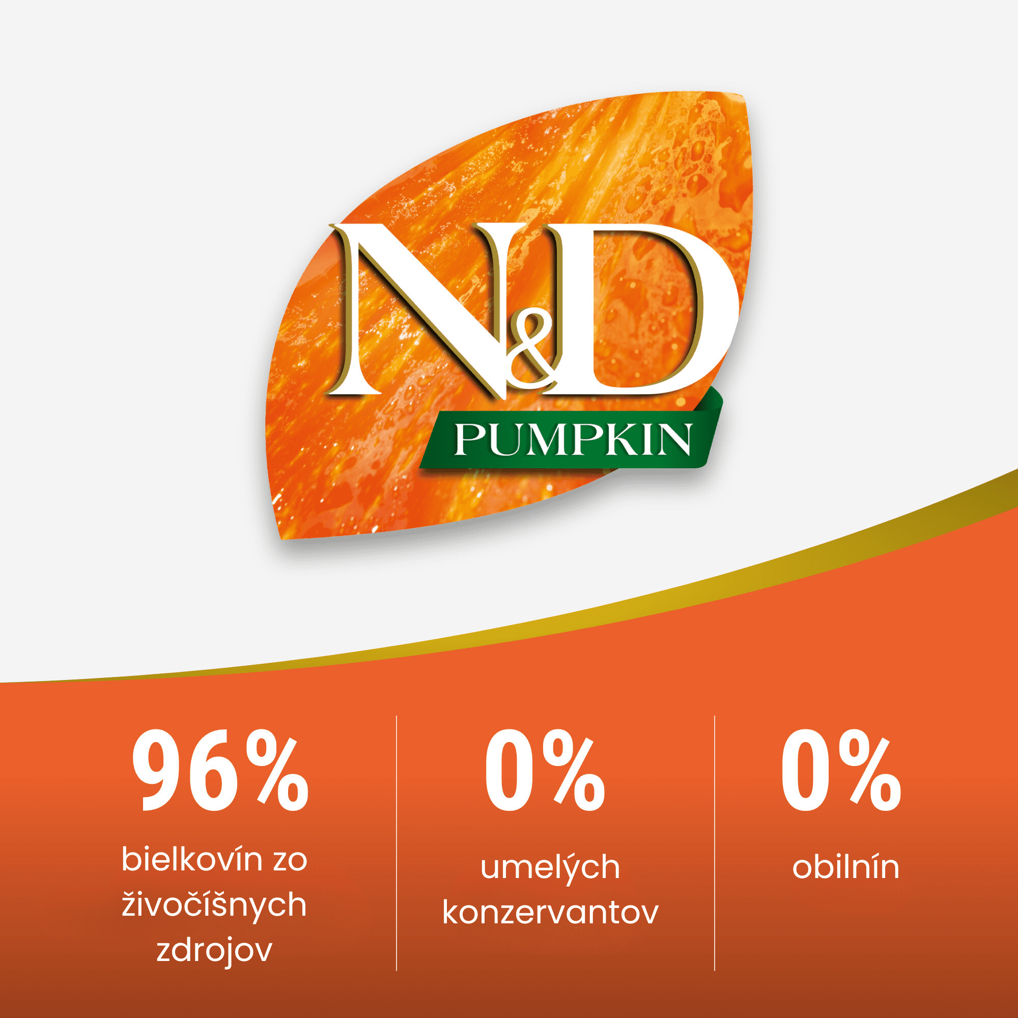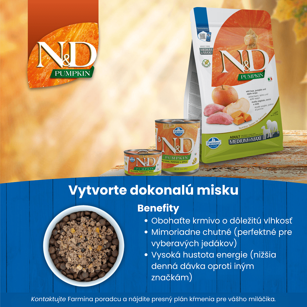 Farmina N&D Pumpkin Wild Boar & Apple Adult Medium & Maxi sú kompletné granuly pre dospelé psy stredných a veľkých plemien. Krmivo obsahuje diviačie mäso ako hlavný zdroj bielkovín a patrí do bezobilninovej rady Pumpkin.