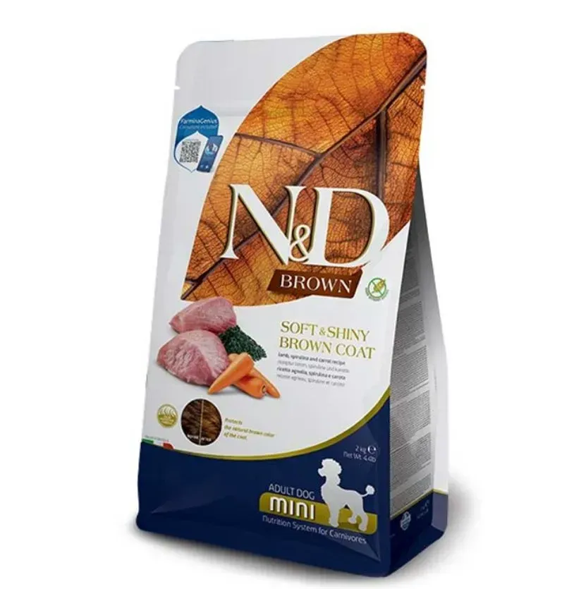Suché krmivo bez obilnín pre malé a miniatúrne psy s červenou alebo hnedou srsťou Farmina N&D Brown Mini Adult Lamb Spirulina & Carrot je kompletné suché krmivo, ktorého granule sú vhodné pre dospelé psy s hmotnosťou do 10 kg. Krmivo obsahuje vysoké množstvo živočíšnych bielkovín, ovocia, zeleniny a minerálov. Granuly tohto krmiva boli vyvinuté v spolupráci s Fakultou výživy zvierat Univerzity v Neapole a sú založené na modeli prírody, pričom zohľadňujú špecifické nutričné potreby dospelých psov malých plemien.
