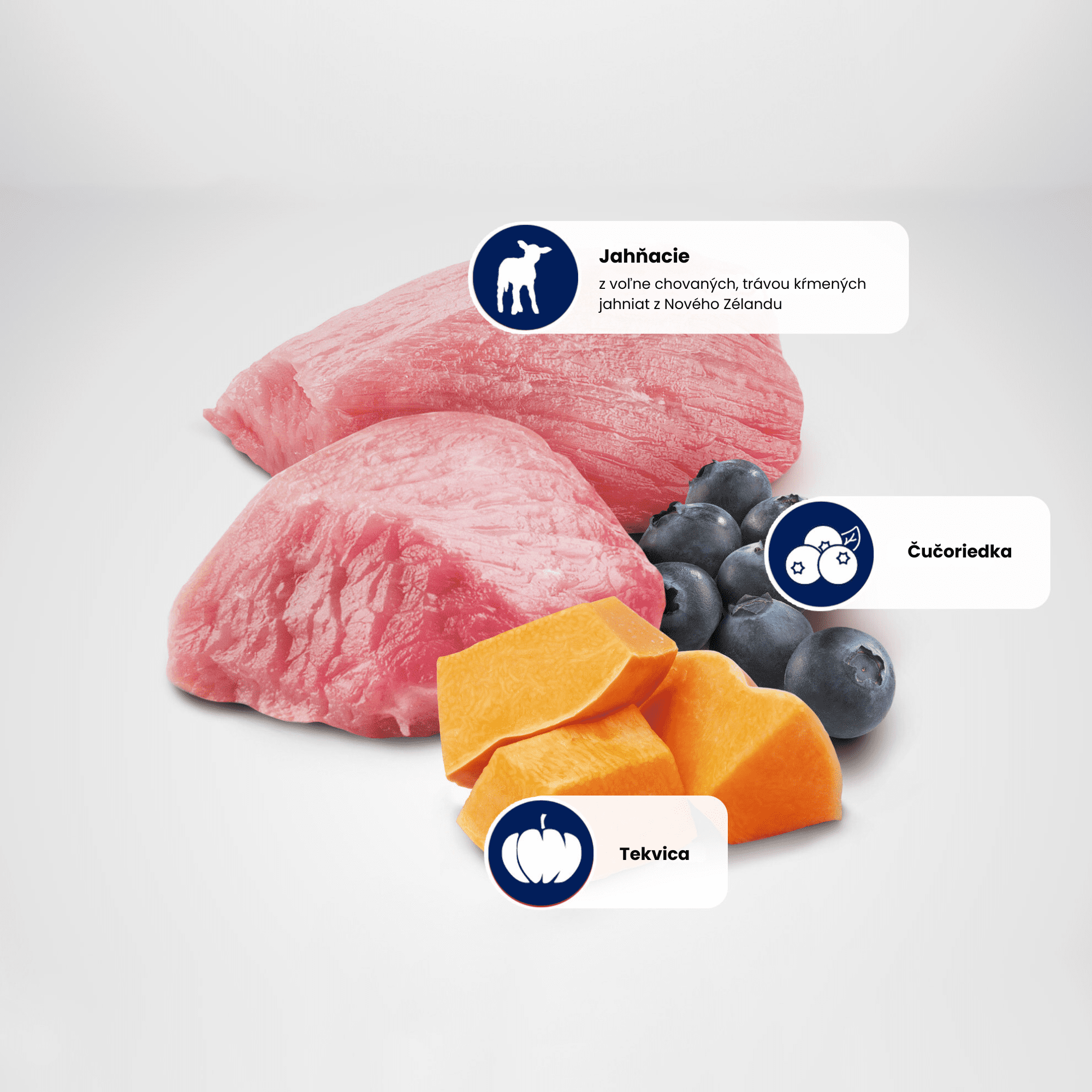 Jahňacie mäso (22%), bielkoviny zo sušeného jahňacieho mäsa (20%), hrachový škrob, kurací tuk, sušená tekvica (5%), sušené vajcia, slede, bielkoviny zo sušených sleďov, rybí tuk (zo sleďov), hrachová vláknina, sušená mrkva, sušená lucerna, inulín, frukto-oligosacharidy, výťažok z kvasníc (zdroj mannán-oligosacharidov), sušené čučoriedky (0.5%), sušené jablká, sušené granátové jablká, sušené sladké pomaranče, sušený špenát, psýllium (semená a plevy) (0.3%), chlorid sodný, sušené pivovarské kvasnice, kurkuma (0.2%), výťažok z aloe vera, glukozamín, chondroitín sulfát.