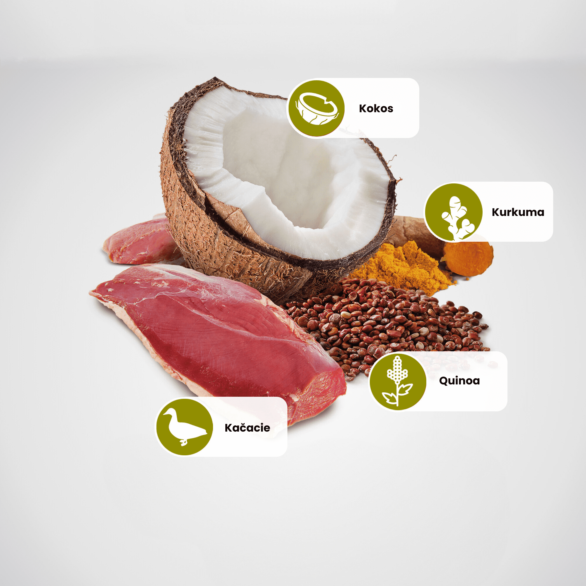 vykostená kačacina (20%), sušený kačací proteín (20%), hrachový škrob, rybí olej (zo sleďov), quinoa (semeno mrlíka bieleho) extrahované (8%), ľanové semená, sušený kokos (2,5%), kurkuma (2,5%), inulín, frukto-oligosacharidy, výťažok z kvasníc (zdroj manno-oligosacharidov), uhličitan vápenatý, hydrogenfosforečnan vápenatý, psýllium (semená a plevy), chlorid draselný, chlorid sodný, sušené pivovarské kvasnice, výťažok z aloe vera, glukozamín, chondroitín sulfát