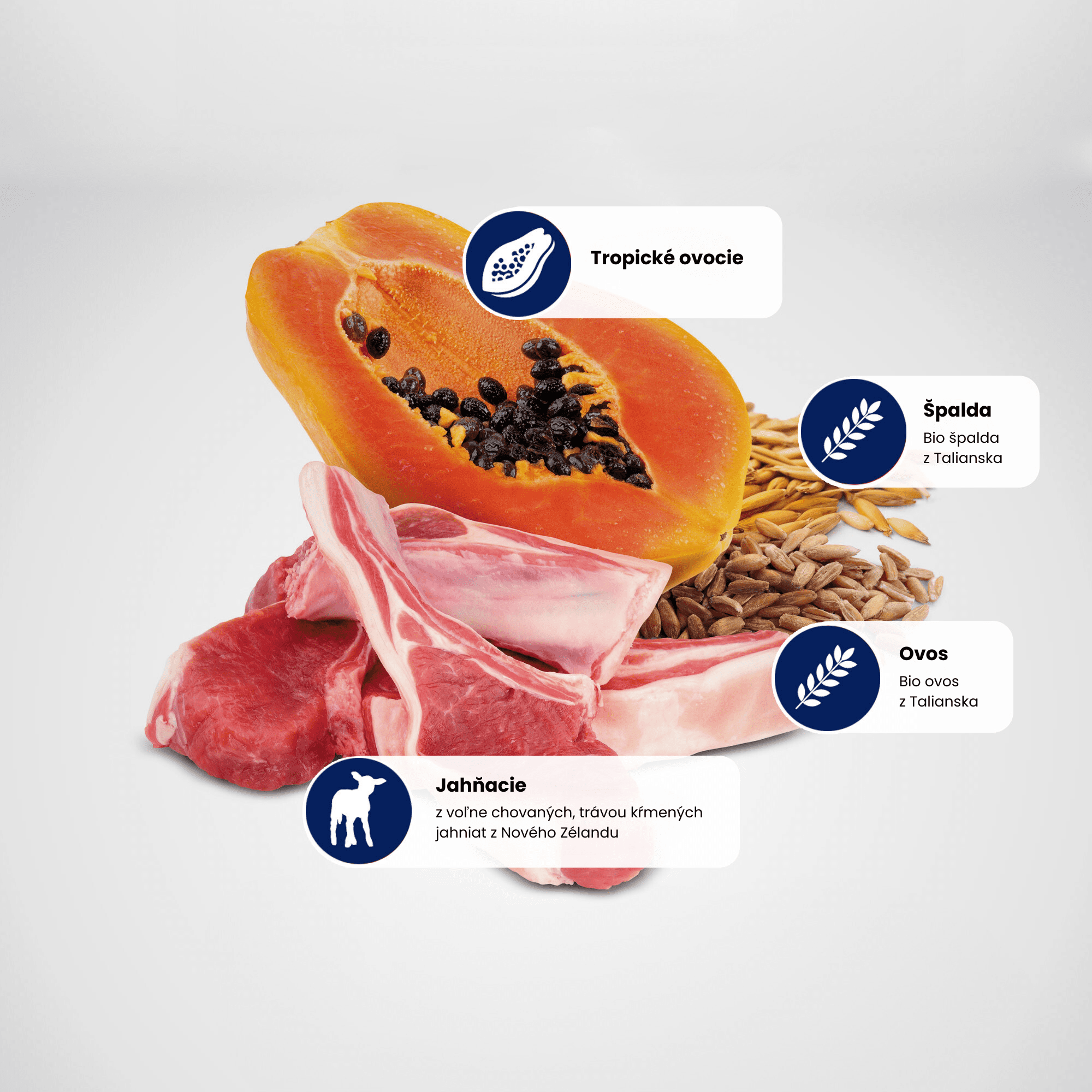 jahňacina 20 %, sušený jahňací proteín 20 %, špalda 12 %, ovos 12 %, cukrovarské rezky sušené, sušený proteín zo sleďa, lucernová múčka, sušené vajcia, kurací tuk, rybí olej, sušená mrkva, inulín, fruktooligosacharidy, výťažok z kvasníc, sušený banán 0,5 %, sušené kiwi 0,5 %, sušené mango 0,5 %, sušená papája 0,5 %, sušený ananás 0,5 %, sušený špenát, psyllium, chlorid sodný, sušené pivovarské kvasnice, kurkuma, výťažok z aloe vera