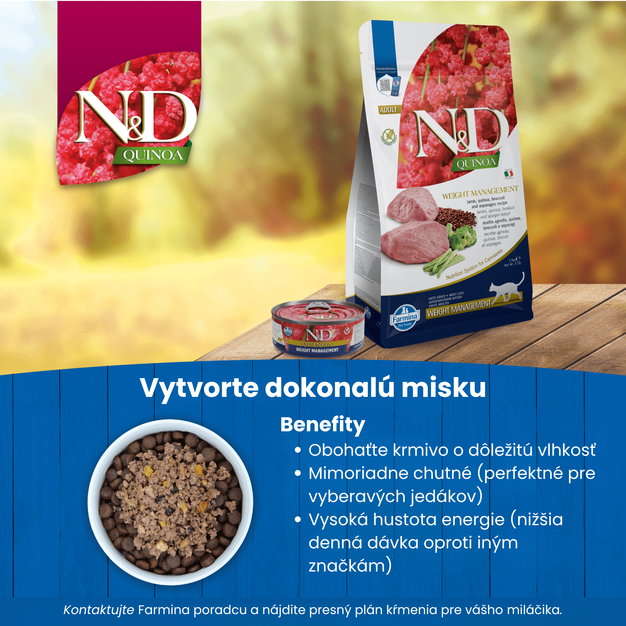 Farmina N&D Quinoa Weight Management – konzervy pre dospelé mačky na reguláciu hmotnosti je kompletné diétne krmivo určené na zníženie nadmernej telesnej hmotnosti u mačiek.