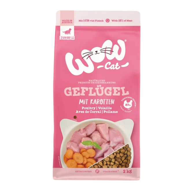 WOW CAT granuly pre mačiatka – hydinové mäso a mrkva predstavujú kompletné suché krmivo, ktoré podporuje zdravý rast a správny vývoj od prvých mesiacov života. Receptúra je navrhnutá tak, aby pokryla všetky nutričné potreby rastúcich mačiatok, pričom zároveň rešpektuje ich prirodzené potreby ako mäsožravcov.