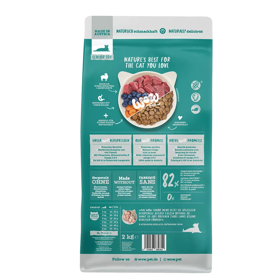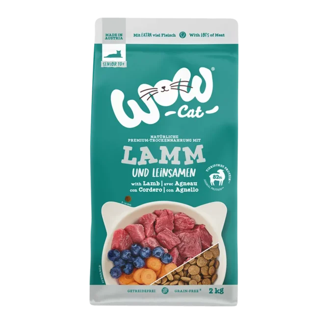 Granuly pre mačky WOW CAT ponúkajú výživu prispôsobenú seniorom. Najskôr zaujme jahňacie mäso, ktoré je dobre stráviteľné a zároveň bohaté na bielkoviny. Následne poteší bezobilninová receptúra, ktorá nezaťažuje trávenie. Okrem toho ľanové semienko podporuje zdravú srsť a pokožku. Navyše vyvážené zloženie pomáha udržať optimálnu hmotnosť a vitalitu.