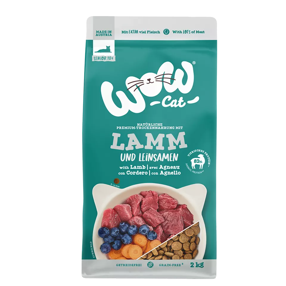 WOW CAT granuly pre mačky senior – jahňacie mäso a ľanové semienko predstavujú kompletné suché krmivo, ktoré zohľadňuje potreby starších mačiek. Receptúra sa zameriava na ľahkú stráviteľnosť a vyvážený príjem živín, pričom zároveň podporuje vitalitu a celkovú pohodu.