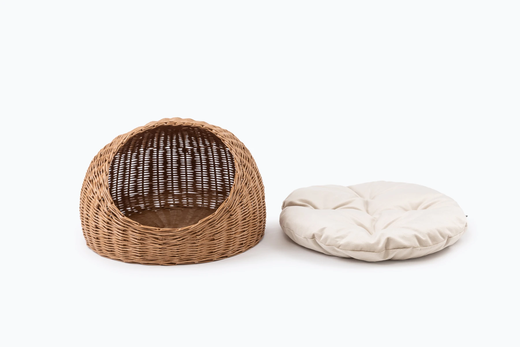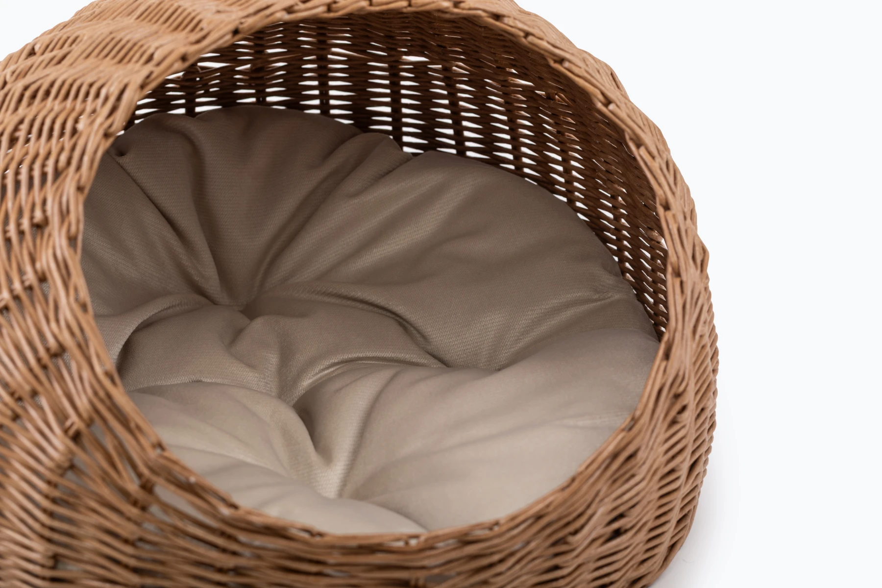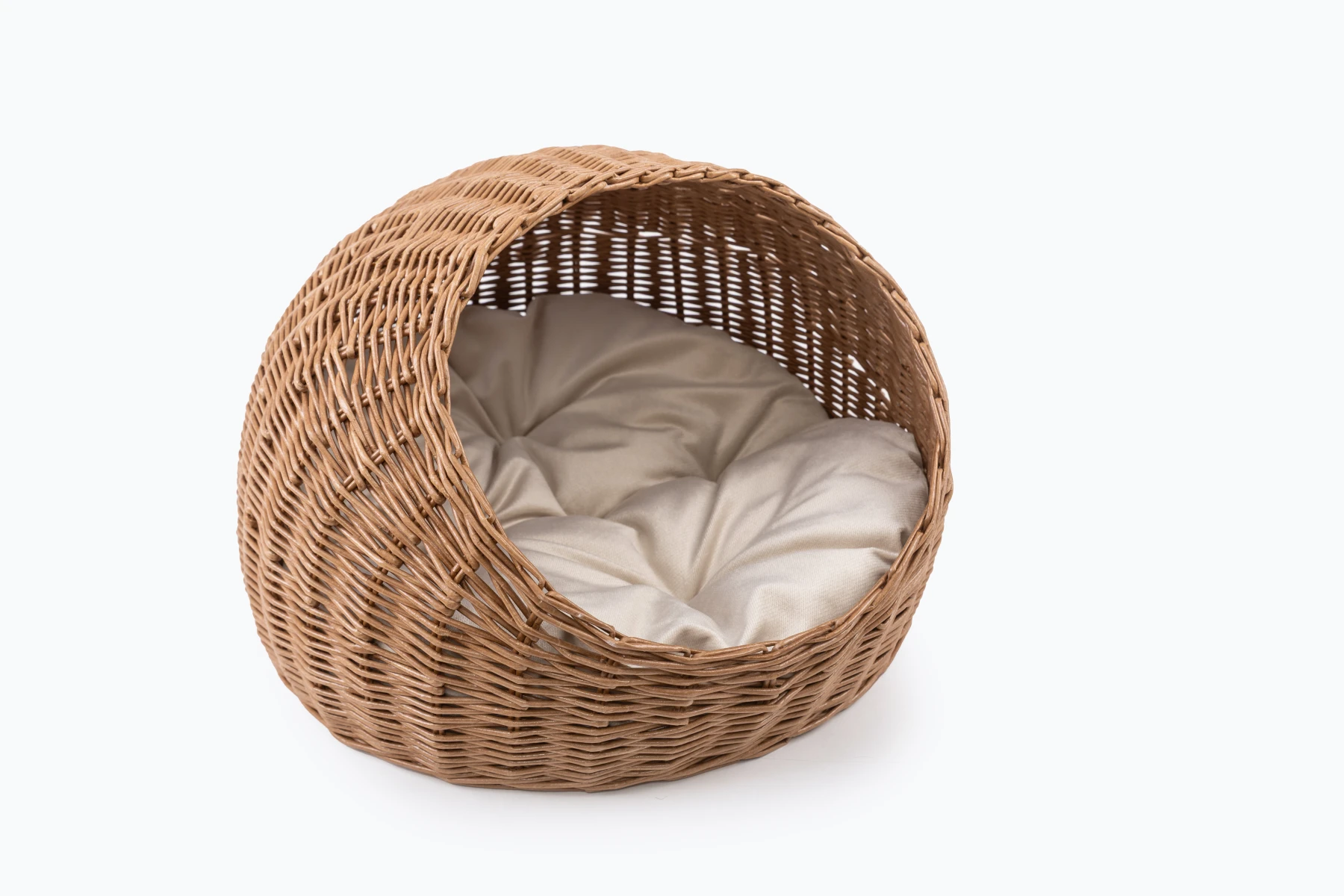 Košík je ručne vyrobený z ekologického papierového prútia. Na rozdiel od prírodného prútia papierové časom nevysychá a nepraská, pričom si zachováva atraktívny vzhľad. Domček je vybavený vankúšom z čalúnnického velúru, naplneným dutým vláknom (hollowfiber), ktorý poskytuje extra pohodlie a teplo. Vďaka technike „prútie do prútia“ výrobok nemá žiadne ostré konce, takže košík je úplne hladký a bezpečný.