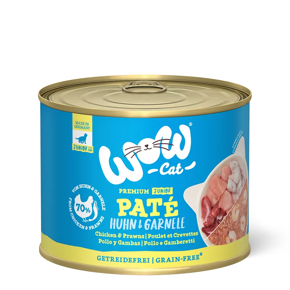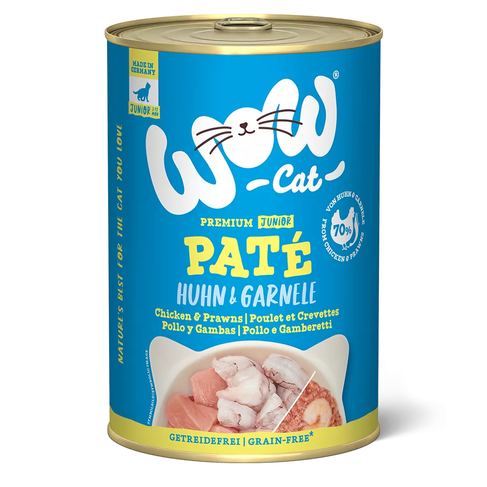 WOW CAT konzerva pre mačiatka – kuracie mäso a krevety paštéta prináša kvalitné mokré krmivo pre zdravý rast a vývoj. Bez obilnín, s vysokým obsahom mäsa a skvelou chuťou pre každodenné kŕmenie.