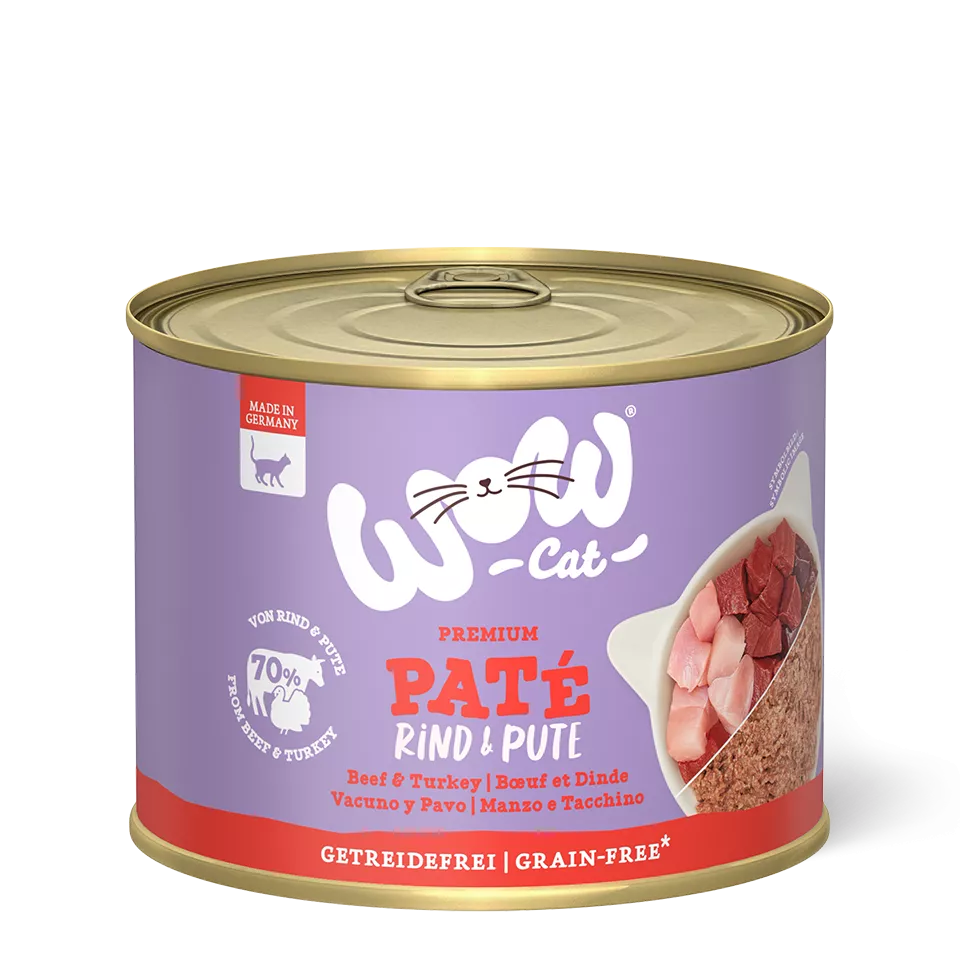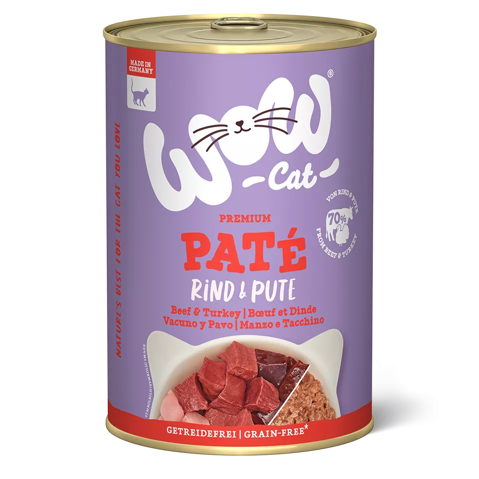WOW CAT konzerva pre mačky – hovädzie a morčacie mäso paštéta predstavuje kompletné mokré krmivo pre dospelé mačky. Receptúra kombinuje dva kvalitné zdroje živočíšnych bielkovín a rešpektuje prirodzené potreby mäsožravcov.