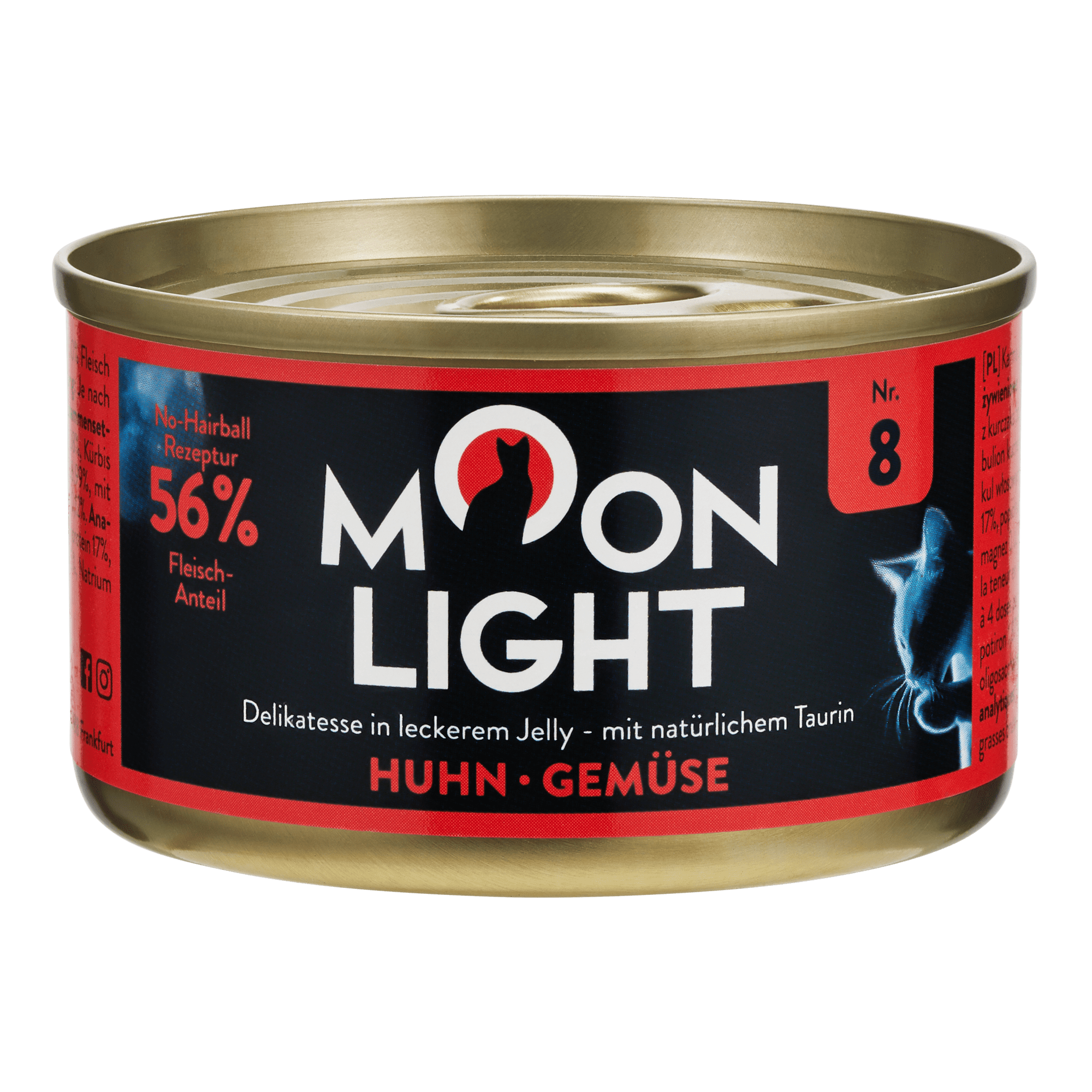 Moonlight konzervy pre mačky predstavujú kvalitné mokré krmivo s dôrazom na prirodzené zloženie. Obsahujú šťavnaté kuracie mäso (min. 60 %), ktoré je ľahko stráviteľné a vhodné aj pre citlivé mačky. Dopĺňa ho zelenina, ktorá prináša prirodzené živiny a podporuje vyváženú stravu.