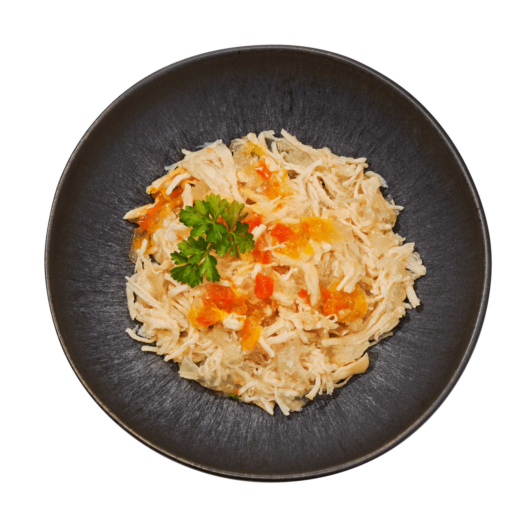 kuracie mäso (60 %), vývar, zelenina (mrkva 4 %, hrášok 4 %), minerálne látky
