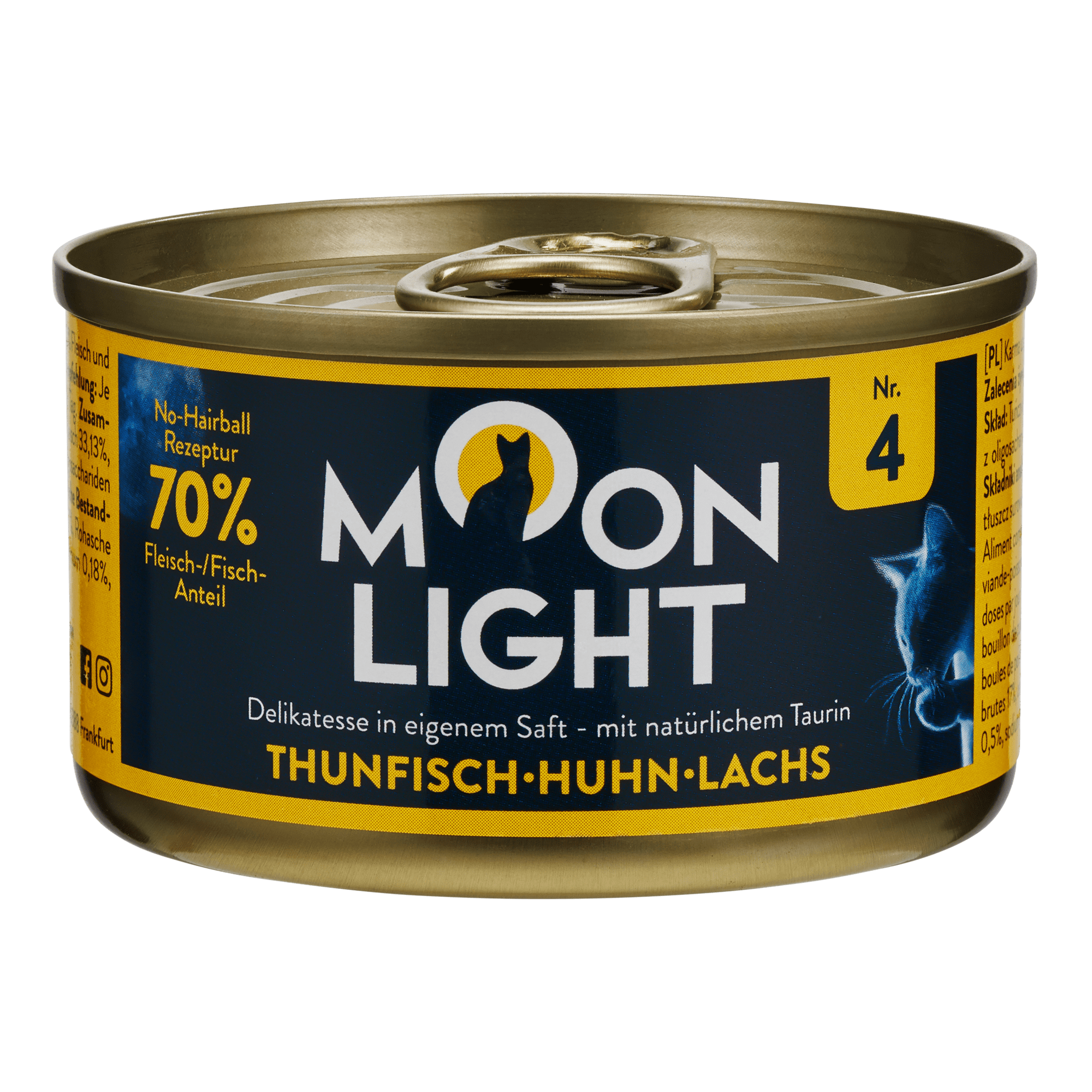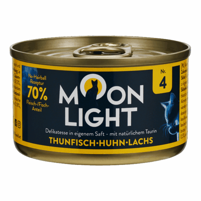 Moonlight konzervy pre mačky s tuniakom, kuracím mäsom a lososom v šťave ponúkajú prémiové zloženie a prirodzenú chuť. Navyše podporujú trávenie a pomáhajú obmedziť tvorbu bezoárov.