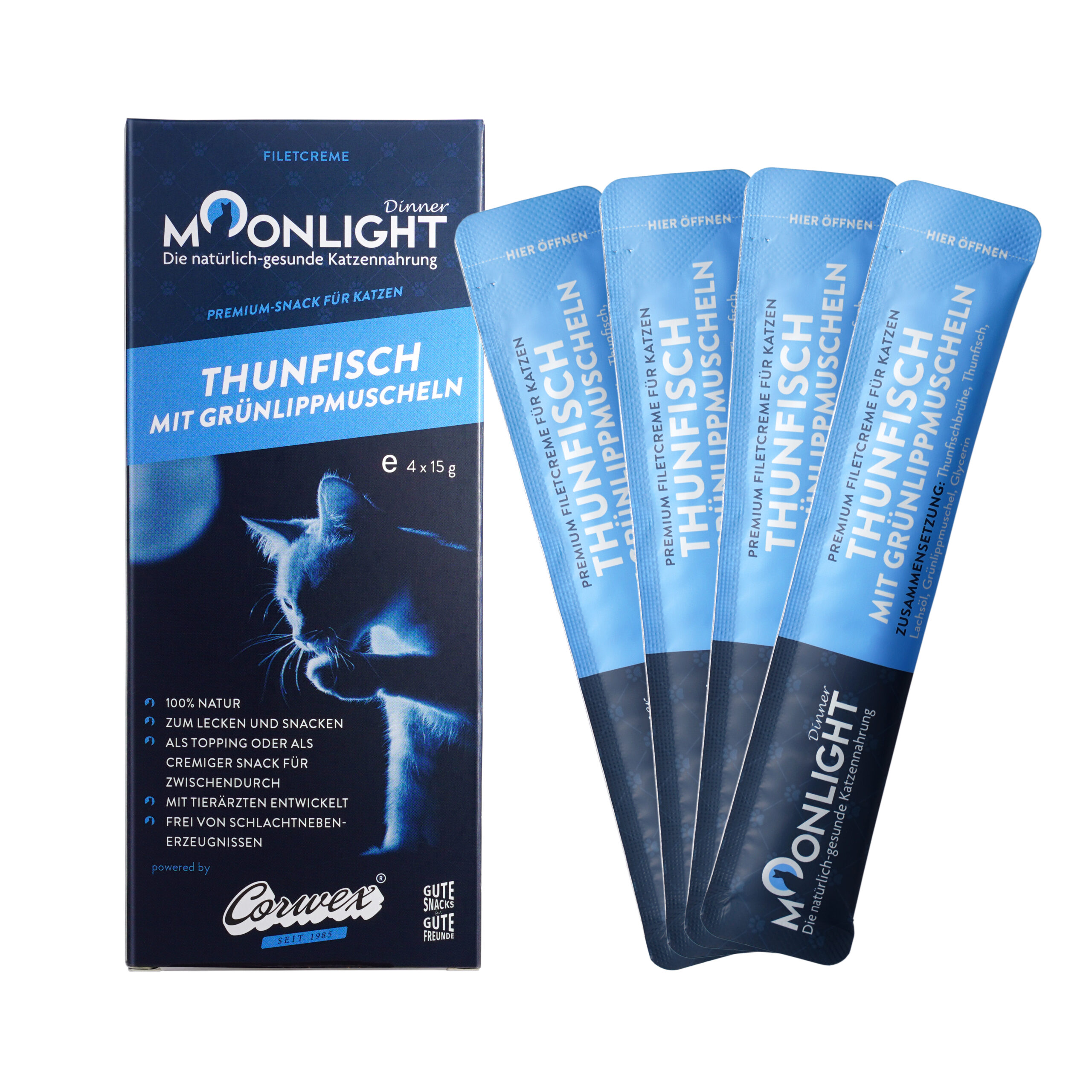 Moonlight krémové maškrty pre mačky predstavujú chutný a zároveň praktický doplnok každodennej stravy. Obsahujú kvalitné filety z tuniaka, ktoré dopĺňa mušľa ako prirodzený zdroj minerálov. Vďaka jemnej krémovej konzistencii sa maškrty ľahko podávajú, pričom ich mačky prijímajú s nadšením.