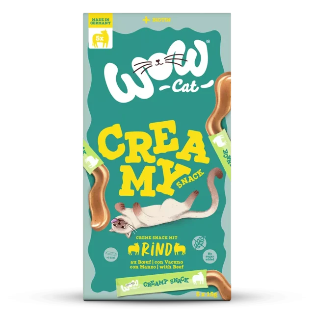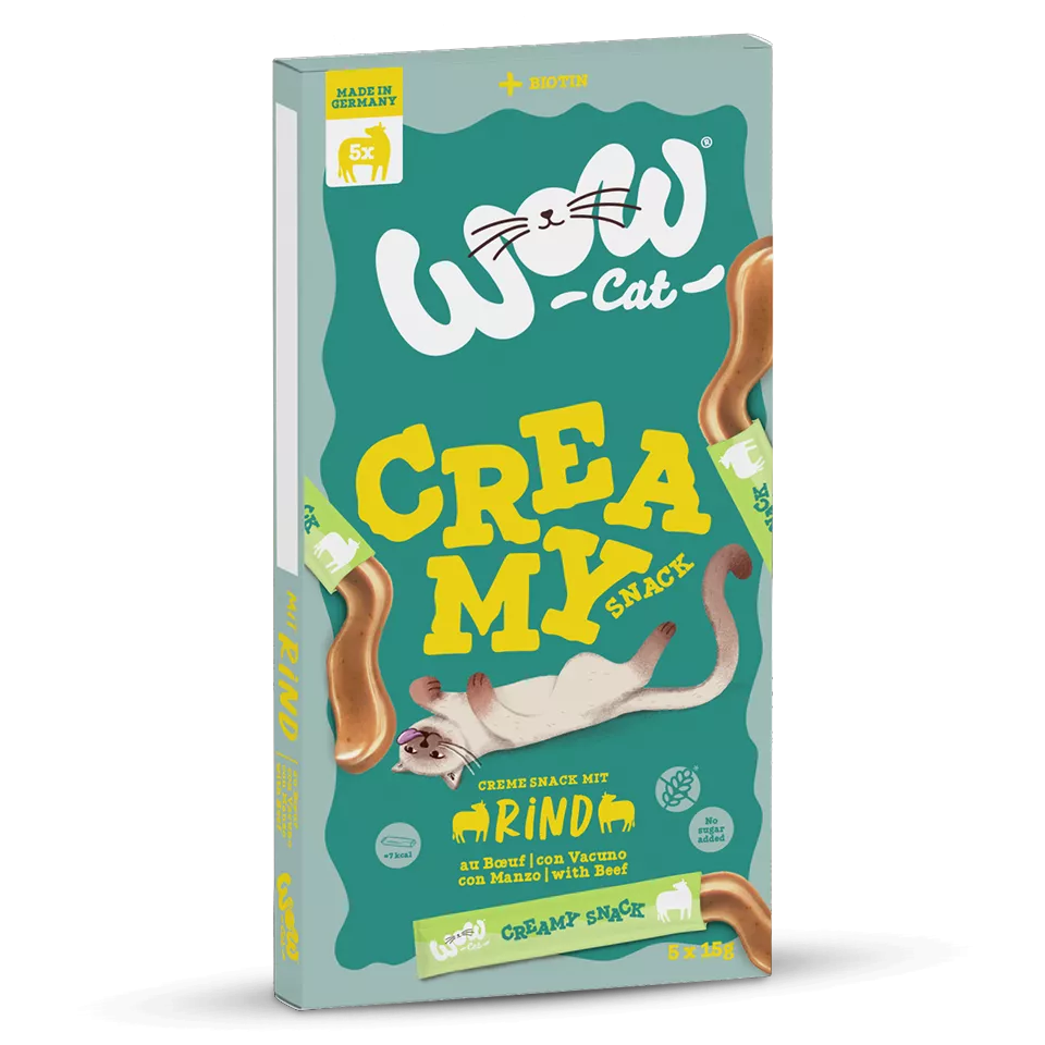 WOW CAT maškrty pre mačky – krémová pochúťka s hovädzím mäsom predstavujú chutný doplnok stravy, ktorý si mačky obľúbia už pri prvom podaní. Vďaka jemnej krémovej konzistencii sa ľahko podávajú a zároveň podporujú príjem tekutín.