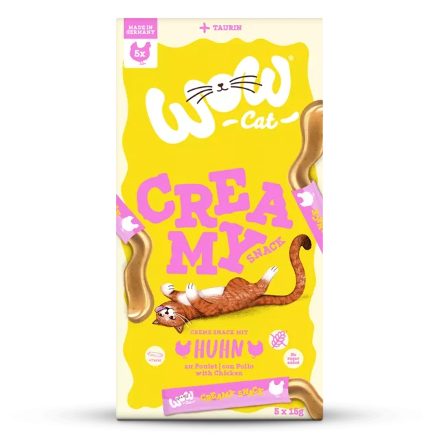 WOW CAT maškrty pre mačky – krémová pochúťka s kuracím mäsom predstavujú chutný doplnok stravy, ktorý si mačky obľúbia už pri prvom podaní. Vďaka jemnej krémovej konzistencii sa ľahko podávajú a zároveň podporujú príjem tekutín.