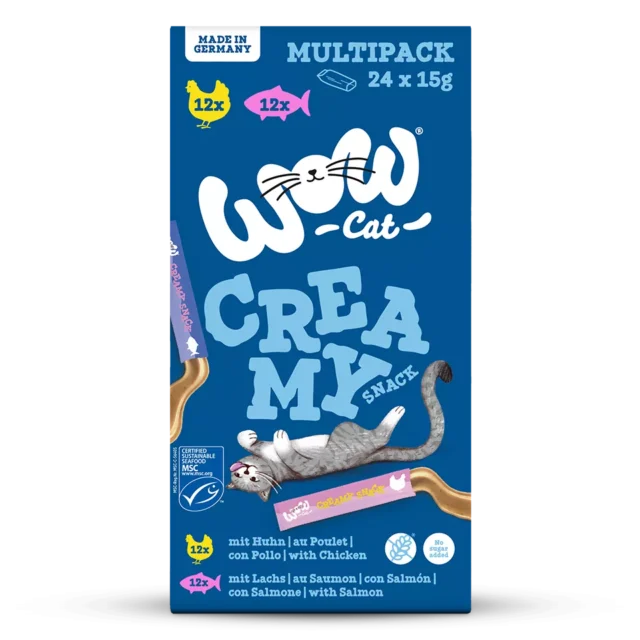 WOW CAT maškrty pre mačky multipack prinášajú kombináciu krémových pochúťok s kuracím mäsom a lososom. Ideálne na každodenné odmeňovanie aj spestrenie jedálnička.