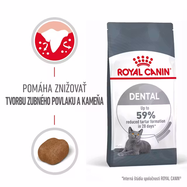 Royal Canin Dental Care sú granule vyvinuté s ohľadom na potrebu podpory dentálneho zdravia dospelých mačiek. Špeciálne navrhnutá textúra granúl vytvára mechanický čistiaci efekt pri žuvaní, ktorý pomáha obmedzovať hromadenie zubného povlaku a zubného kameňa.