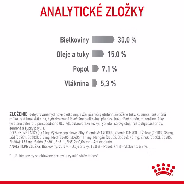 dehydrované hydinové bielkoviny, ryža, pšeničný glutén, živočíšne tuky, kukurica, kukuričná múka, rastlinná vláknina, hydrolyzované živočíšne bielkoviny, pšenica, kukuričný glutén, minerálne látky (vrátane trifosfátu pentasodného (0,2 %)), cukrovarské rezky, rybí olej, sójový olej, fruktooligosacharidy, semená a šupky psyllia