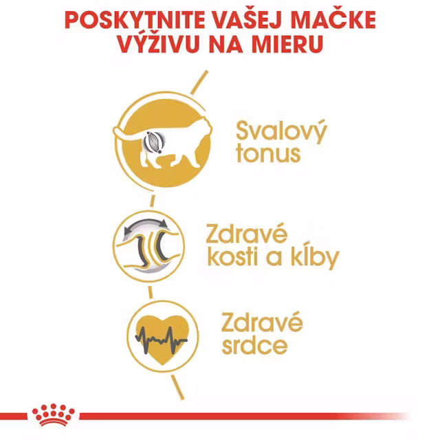 Granule pre britské krátkosrsté mačky – na čo slúžia Royal Canin FBN Cat British Shorthair sú granule vyvinuté s ohľadom na špecifické nutričné potreby britských krátkosrstých mačiek. Prispôsobená hladina bielkovín prispieva k udržaniu svalovej hmoty a L-karnitín podporuje metabolizmus tukov. Receptúra je obohatená o omega-3 mastné kyseliny EPA a DHA, ktoré podporujú zdravie kostí a kĺbov a pomáhajú udržiavať prirodzenú úroveň aktivity. Taurín spolu s EPA a DHA prispieva k zdravej funkcii srdca. Vyvážený obsah minerálov podporuje zdravie močových ciest dospelých mačiek. Veľké granule so zakriveným tvarom sú prispôsobené širokej čeľusti britskej krátkosrstej mačky, uľahčujú uchopenie a podporujú žuvanie, čím prispievajú k ústnej hygiene. Produkt nie je liek ani veterinárny liečivý prípravok. Pre koho je vhodný – dospelé britské krátkosrsté mačky – vhodné od 12 mesiacov veku – určené pre mačky s robustnou a svalnatou telesnou stavbou – vhodné na každodenné kŕmenie Ako používať – podávajte granule podľa odporúčaného dávkovania – množstvo upravte podľa hmotnosti a úrovne aktivity mačky – zabezpečte neustály prístup k čerstvej pitnej vode – skladujte na suchom a chladnom mieste Zloženie dehydrované hydinové bielkoviny, ryža, pšeničný glutén*, živočíšne tuky, kukurica, hydrolyzované živočíšne bielkoviny, kukuričný glutén, rastlinná vláknina, dužina čakanky, minerálne látky, sójový olej, rybí olej, kvasnicové produkty, fruktooligosacharidy, kvasnice (zdroj mannánoligosacharidov), borákový olej, glukozamín z fermentácie, múčka z aksamietnic, hydrolyzovaná chrupavka (zdroj chondroitínu) *L.I.P.: bielkoviny selektované pre svoju vysokú stráviteľnosť. Analytické zložky bielkoviny 34,0 % oleje a tuky 19,0 % vláknina 5,4 % popol 7,1 % omega-3 mastné kyseliny 0,9 % EPA/DHA 0,4 % L-karnitín 200 mg/kg Doplnkové látky (na 1 kg) Výživné doplnkové látky: Vitamín A 30 900 IU Vitamín D3 825 IU Taurín 3 g Železo (3b103) 39 mg Jód (3b201, 3b202) 3,9 mg Meď (3b405, 3b406) 12 mg Mangán (3b502, 3b504) 51 mg Zinok (3b603, 3b605, 3b606) 136 mg Selén (3b801, 3b811, 3b812) 0,08 mg Technologické doplnkové látky: Klinoptilolit sedimentárneho pôvodu 10 g Antioxidanty   Kŕmna tabuľka 3–4 kg – nízka potreba energie: 34–41 g – aktívna mačka: 42–52 g 5–6 kg – nízka potreba energie: 49–55 g – aktívna mačka: 61–69 g 7–8 kg – nízka potreba energie: 62–68 g – aktívna mačka: 77–85 g   Prečo si vybrať Royal Canin FBN Cat British Shorthair – granule špeciálne pre britské krátkosrsté mačky – podpora svalového tonusu – L-karnitín a taurín pre metabolizmus a srdce – podpora zdravia kostí a kĺbov – zdravie močových ciest – veľké granule prispôsobené širokej čeľusti Tip pre chovateľov Pri kŕmení sledujte kondíciu mačky a upravujte dávkovanie podľa jej potrieb.