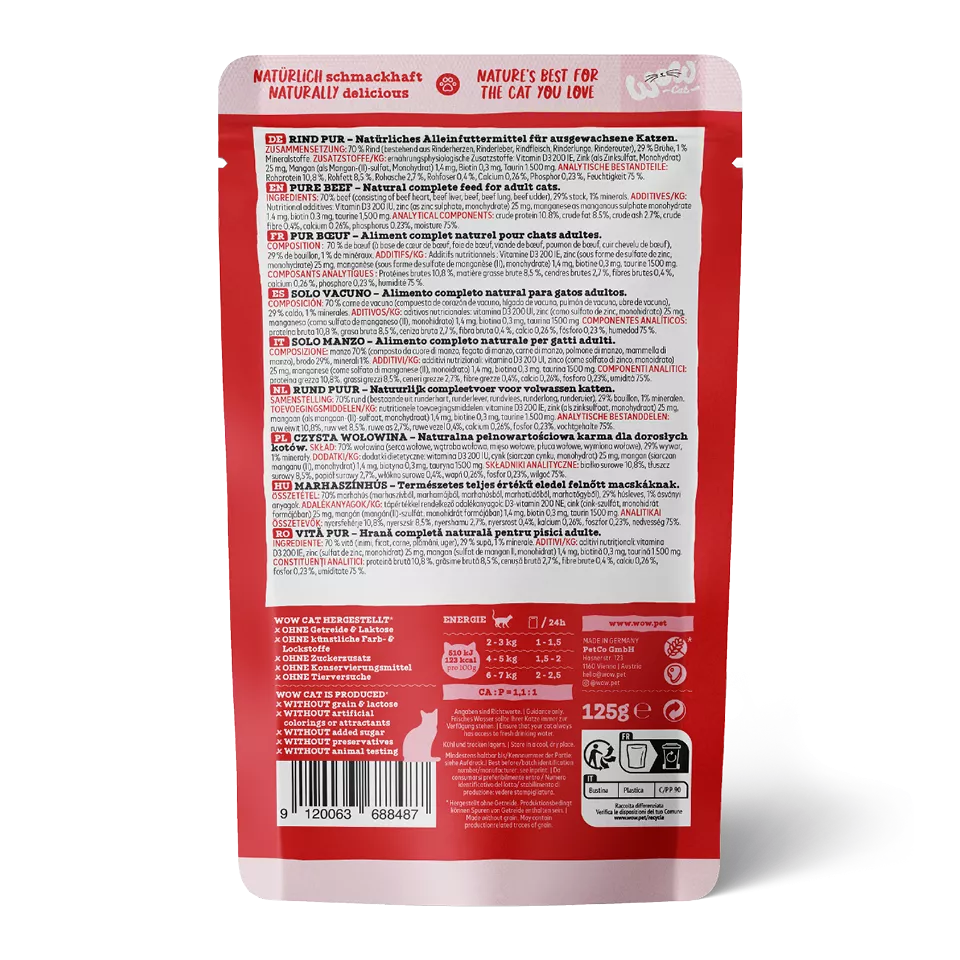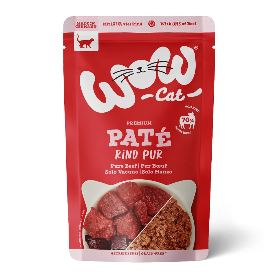 WOW CAT kapsičky pre mačky s čistým hovädzím mäsom obsahujú jemnú paštétu s vysokým podielom živočíšnych surovín. Ide o kompletné mokré krmivo pre mačky vhodné na každodenné kŕmenie. Receptúra je pripravená bez obilnín a pridaného cukru. Tieto kapsičky pre mačky majú výraznú mäsovú chuť, ktorú väčšina mačiek prijíma veľmi ochotne.