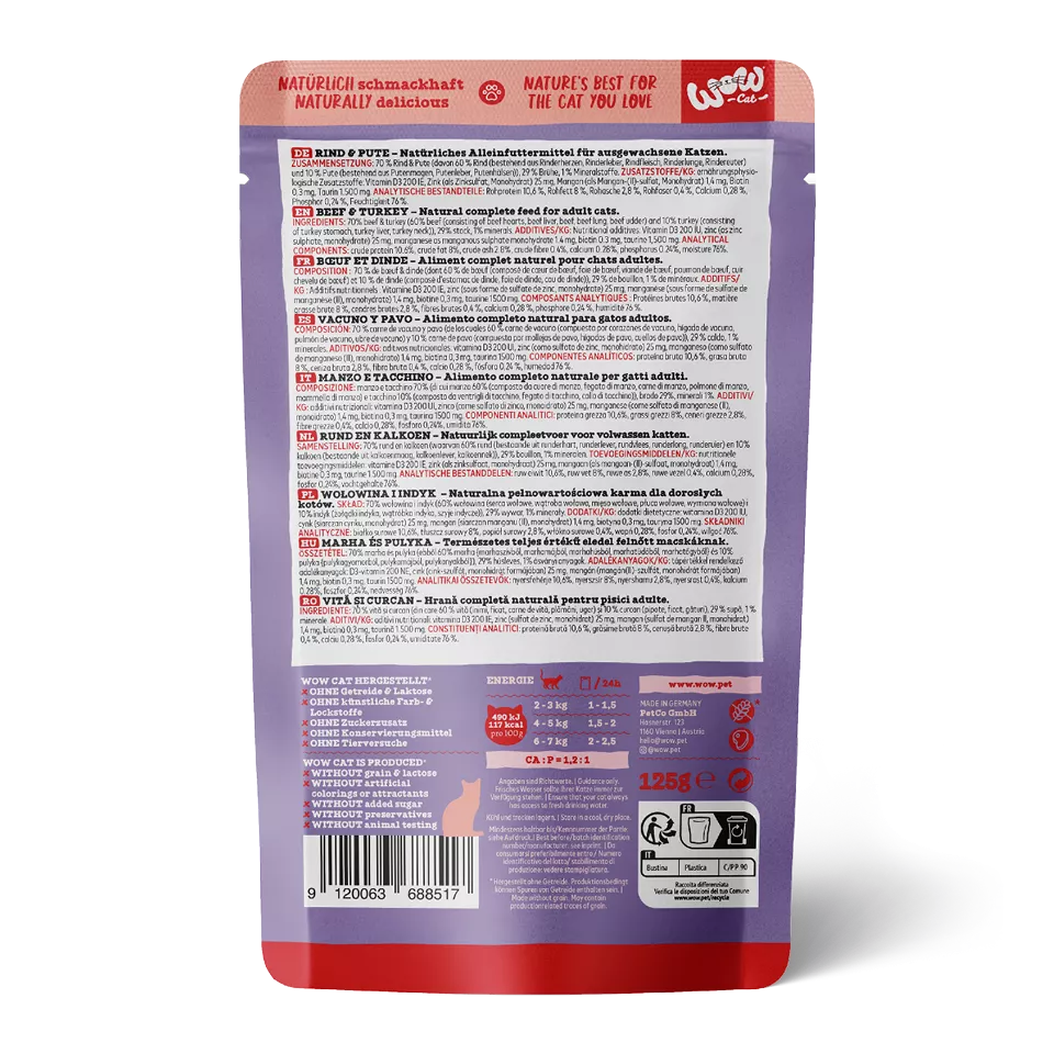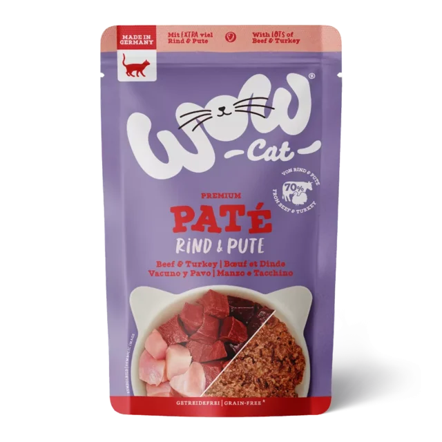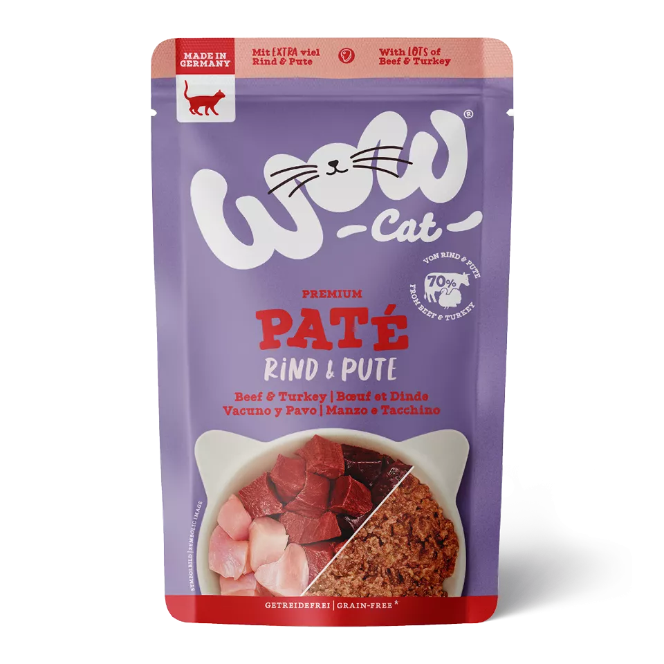WOW CAT kapsičky pre mačky s hovädzím a morčacím mäsom predstavujú kompletné mokré krmivo pre každodenné kŕmenie. Jemná paštéta má hladkú textúru, ktorá sa ľahko konzumuje. Práve preto tieto kapsičky pre mačky dobre prijímajú aj vyberavejšie mačky.