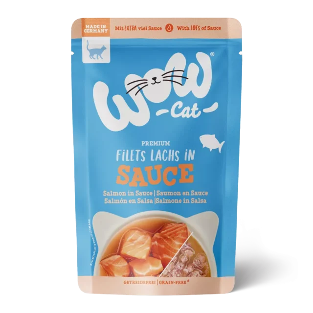 WOW CAT kapsičky pre mačky s lososom v omáčke predstavujú chutné mokré krmivo na každodenné kŕmenie. Jemné kúsky filet sú ponorené v šťavnatej omáčke, ktorá podporuje chuť do jedla. Práve preto tieto kapsičky pre mačky často chutia aj vyberavejším mačkám.