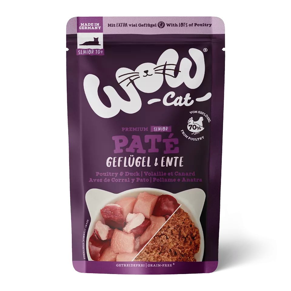 WOW CAT kapsičky pre senior mačky s hydinou a kačicou predstavujú kompletné mokré krmivo pre staršie mačky. Jemná paštéta má hladkú textúru, ktorá sa ľahko konzumuje. Práve preto tieto kapsičky pre senior mačky dobre prijímajú aj mačky vo vyššom veku.