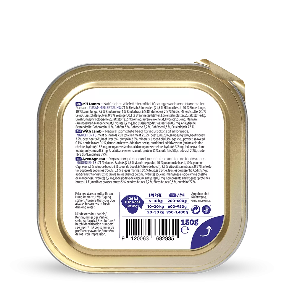 mäso a vnútornosti 71 % (kuracie mäso 21,5 %, hovädzie pľúca 20 %, jahňacie pľúca 10 %, hovädzie obličky 7,5 %, hovädzie srdce 6 %, hovädzia pečeň 6 %), tekvica 2,5 %, minerály, ľanový olej 0,1 %, prášok z vaječných škrupín, morské riasy 0,1 %, listy žihľavy 0,1 %, listy púpavy.