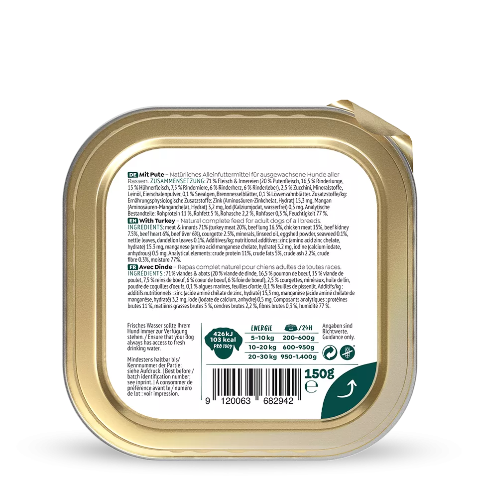 mäso a vnútornosti 71 % (morčacie mäso 20 %, hovädzie pľúca 16,5 %, kuracie mäso 15 %, hovädzie obličky 7,5 %, hovädzie srdce 6 %, hovädzia pečeň 6 %), cuketa 2,5 %, minerály, ľanový olej, prášok z vaječných škrupín, morské riasy 0,1 %, listy žihľavy, listy púpavy 0,1 %.
